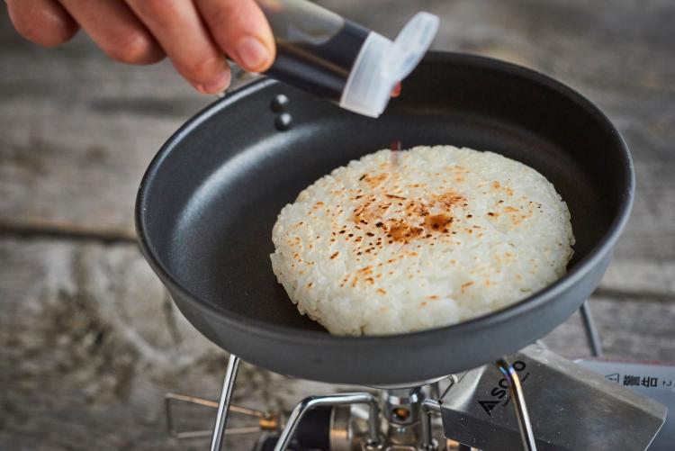 3おなじフライパンにおにぎり1 個を出し、丸く伸ばして両面を焼き、 しょう油をひと回しかける。もうひとつも同様に焼く。