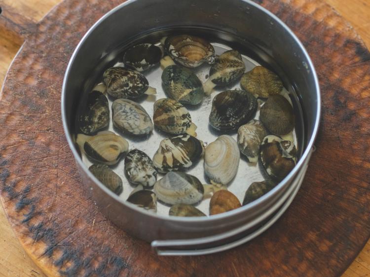 2弱火にかけたミニパンに植物油を回し入れ、アサリを入れる。
