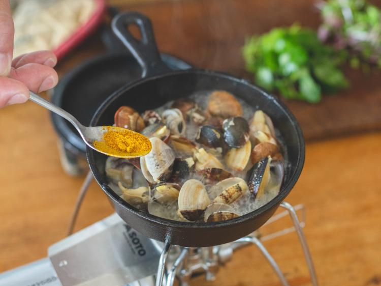 定番のアサリの酒蒸しをカレー風味にすることで食欲が増してお酒が進む。スパイシーなカレー風味は日本酒や焼酎との相性がいい。スプラウトにはアサリのうま味がギュッとしみこむ。蓋は殻入れに使える!