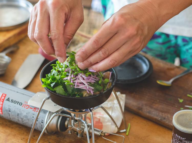 6カイワレとミツバを上に盛って蓋をして、予熱で1分蒸す。