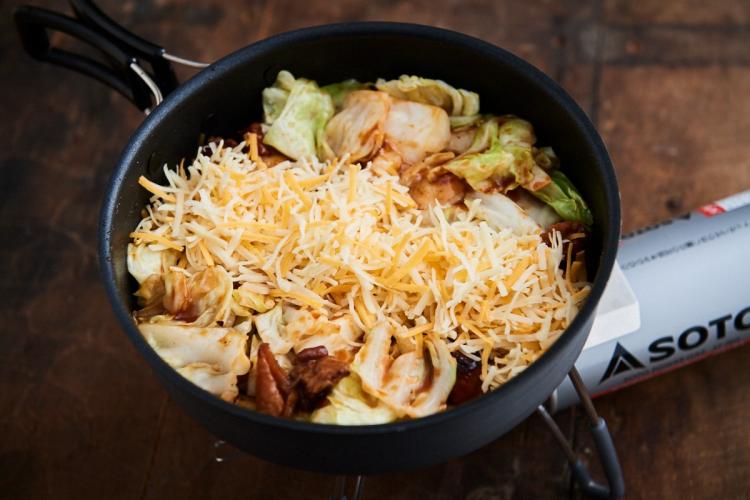 3キャベツがしんなりしてきたら、コチュジャンを加えて混ぜ、チーズを入れる。チーズを加えるときは、具材を両端に寄せて中央を空けて、 空いたところにのせると◎ 。