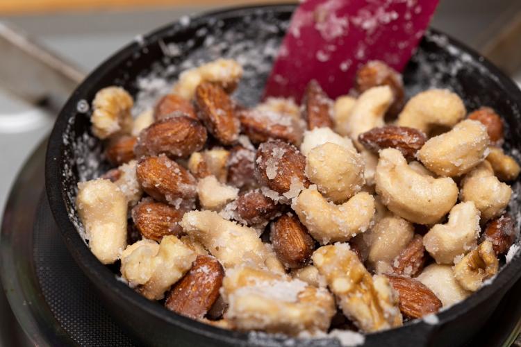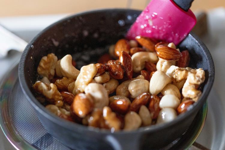 2沸騰したらミックスナッツを加え、耐熱性ゴムベラでかき混ぜる。