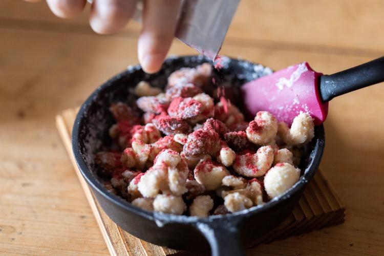 キャンプの合間に作ってちょいちょい食べたくなる砂糖衣がけのナッツ。赤いイチゴパウダーをまぶせば、ほんのり香るイチゴの風味とかわいい見た目で気分が上がるはず。
