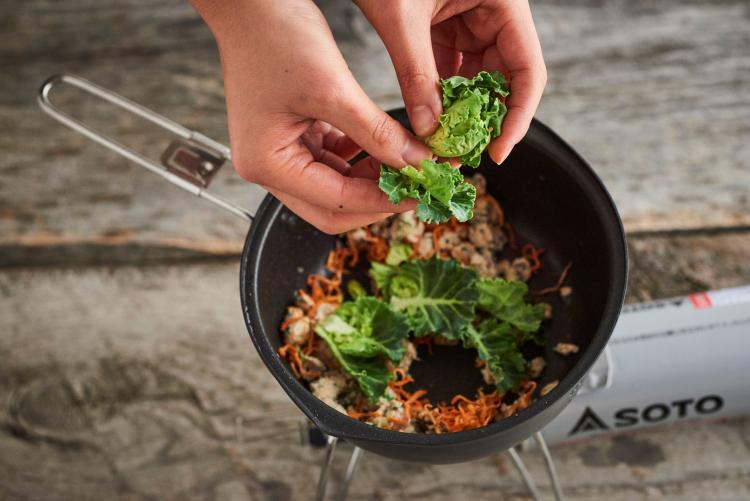 4干しニンジン、プチヴェールを加えて炒め、しんなりしたら焼きそば、水を加えて麺をほぐしながら炒める。
