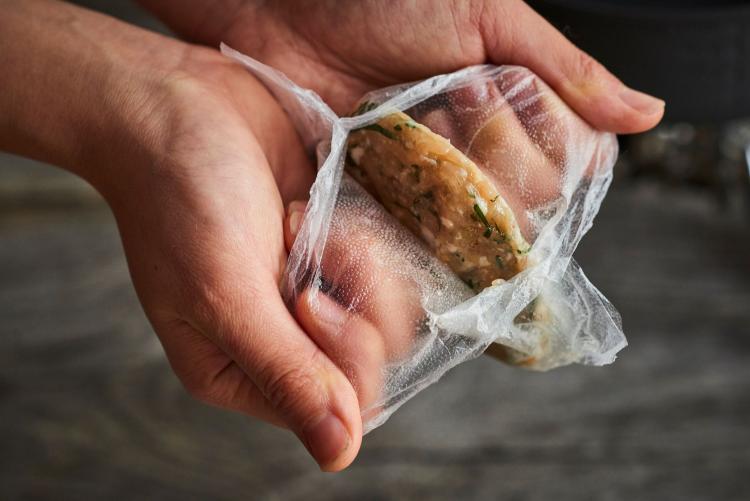 1ボウルに鶏ひき肉、青じそ、ショウガ、ポン酢、しょう油、塩を入れてよく混ぜ、ラップなどで 包んで冷凍する。