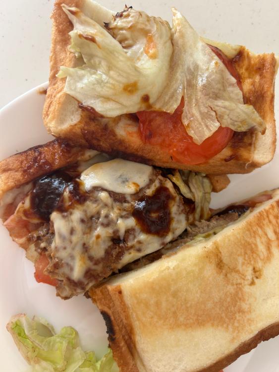 食パン、トマト、レタス、とろけるチーズ、ハンバーグ、とろけるチーズ、レタス、トマト?食パンの順に重ねて、ホットサンドメーカーで挟みます。 -