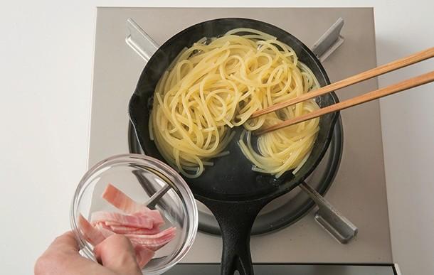 袋の表示ゆで時間の半分弱になったら火を強め、底が見えるくらいに水分が少なくなったところでベーコンを加えます。生クリームを加えたら、とろみが出て麺にからむくらいになるまで煮つめます。