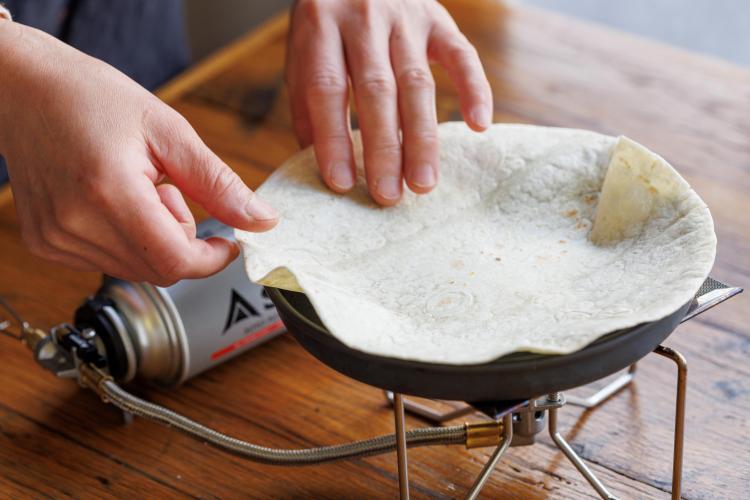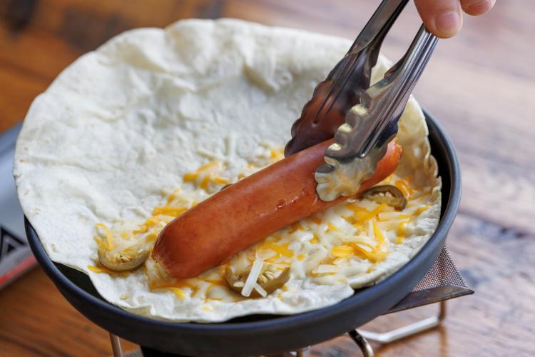 2ソーセージに火が入り、水がなくなったら取り出す。トルティーヤを焦げないように焼く。