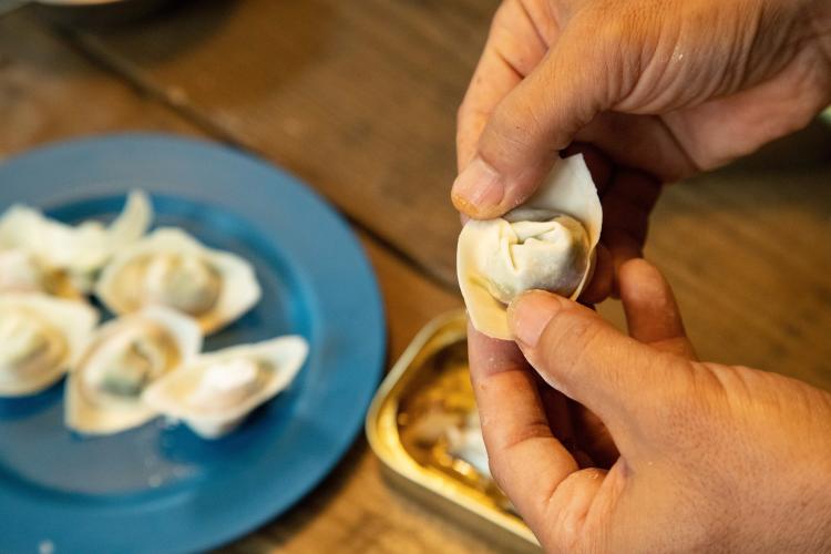 皮の上に具を置いたら半分に折る。弧になっているほうの両端を摘んだら、 中央に寄せてくっつける