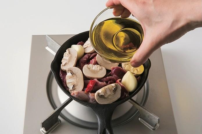・砂肝を並べ、マッシュルーム、にんにく、赤唐辛子をのせ、塩をふって油を注ぎます。