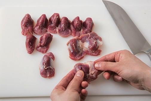 ・砂肝は白い筋を取って柔らかく仕上げます。切り目を入れてから白い部分を手で引っ張ります。