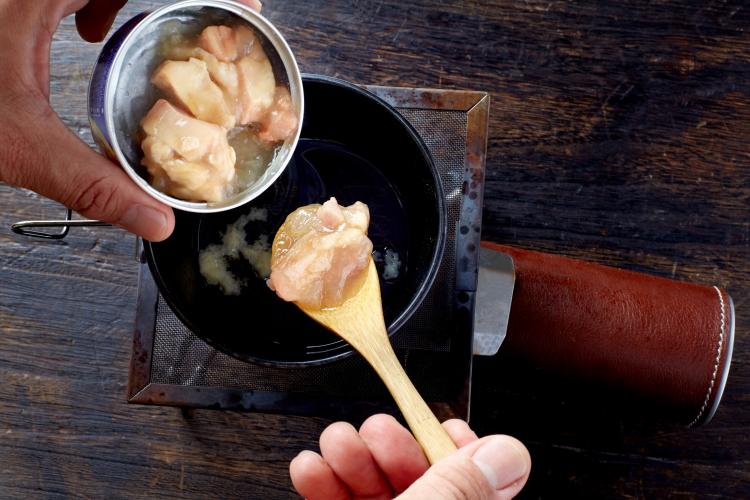 1シェラカップにオリーブ油をひいて火にかけ、ニンニクを入れて香りが立ってきたら焼き鳥缶を加えて炒める。