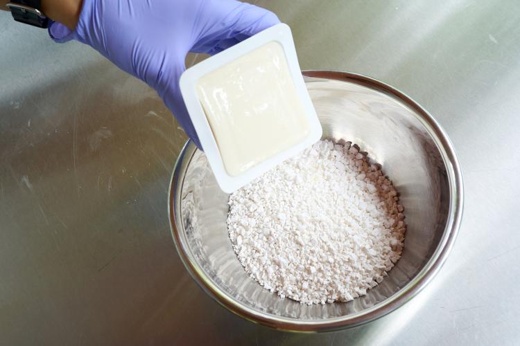 ・白玉粉に豆腐を入れる。水でもいいが豆腐のほうがお団子が柔らかくなり、硬くなりにくい