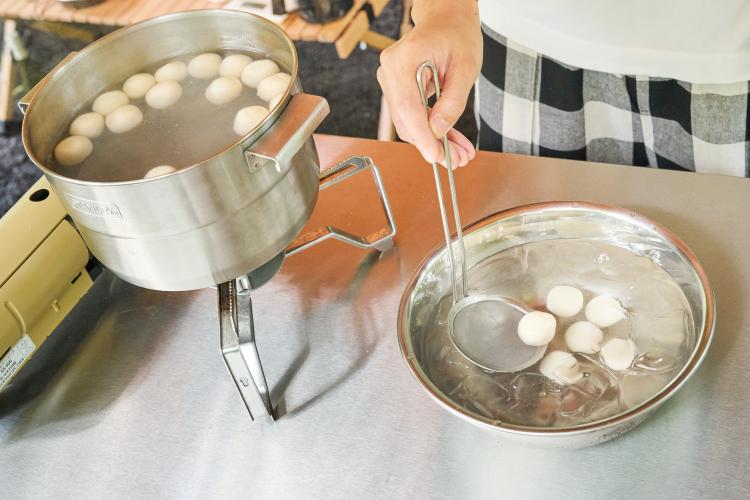 ・茹で上がりの目安は浮き上がりを待つだけ。上がってきた団子を掬ったらすぐに氷水で締める