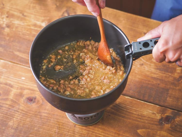 1レトルトライスをクッカーに入れた少量のお湯(分量外)で湯せんする。